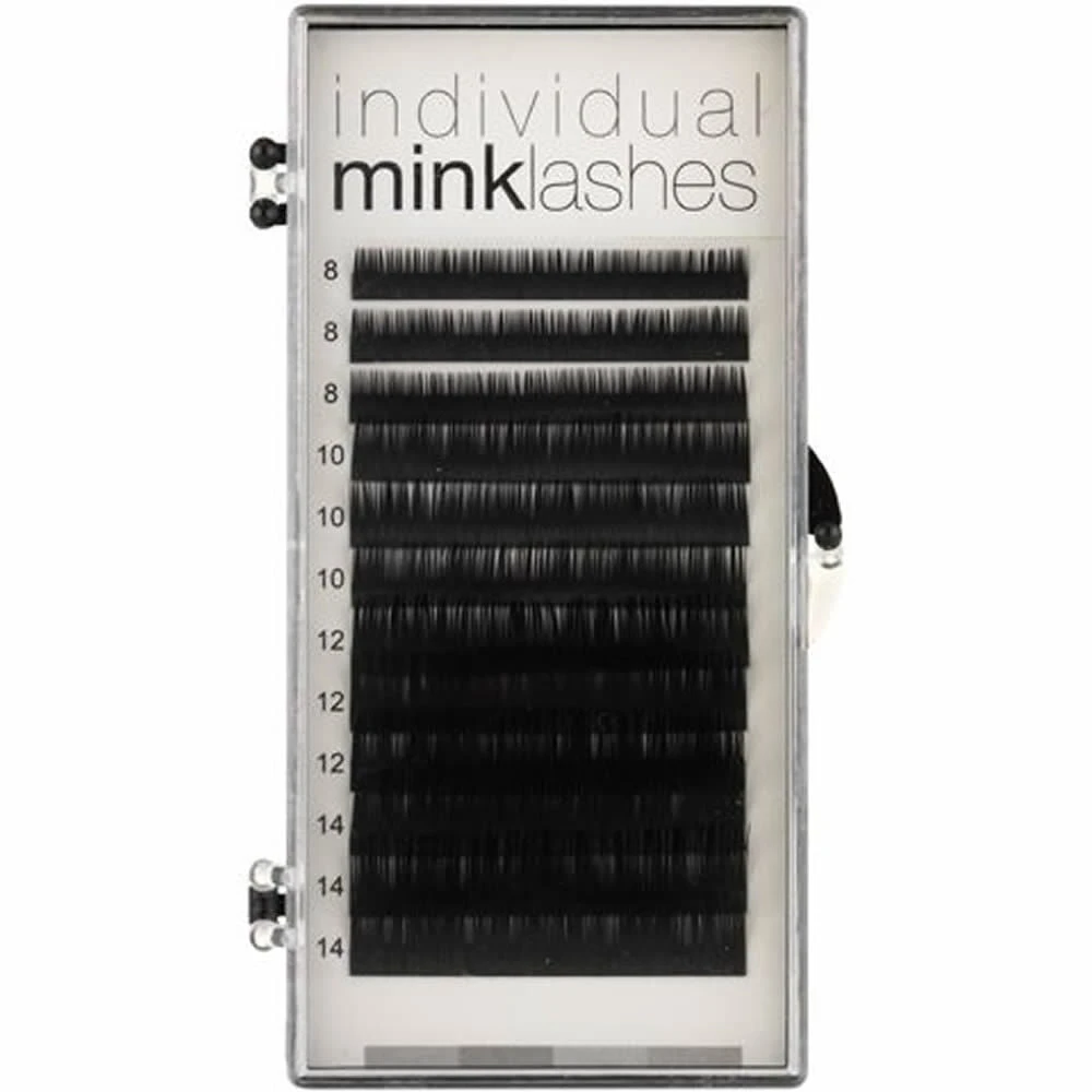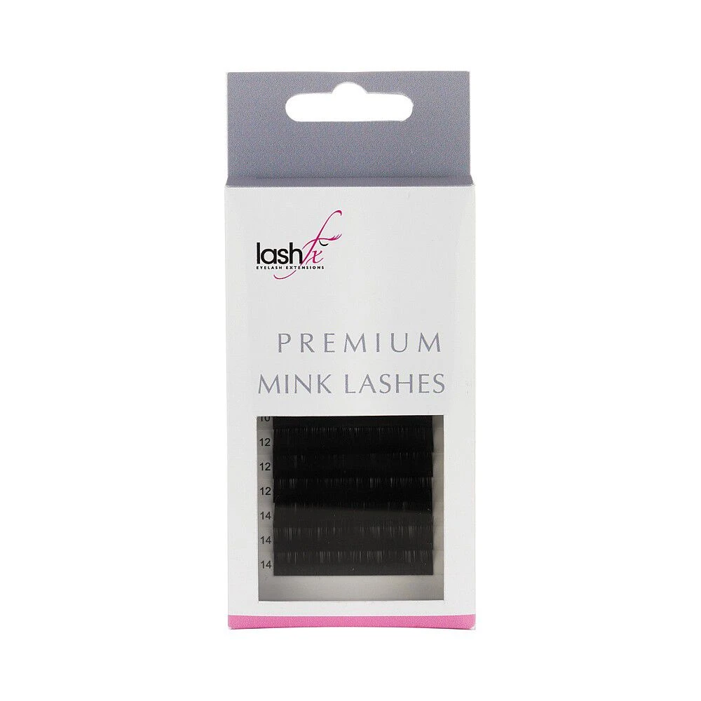 Featherlight genuine mink lashes from Lash FX. With a stunning sheen and a softer texture than regular synthetic eyelashes for a beautifully natural look. These striking salon-quality eyelash extensions add fullness to create defined eyes that demand attention. B Curl Extra Thick. An assortment of ODD sizes only (9mm – 15mm).