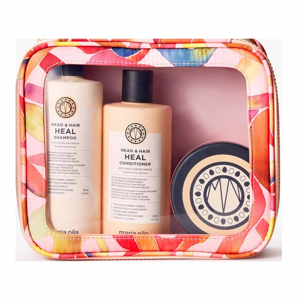 The Head & Hair Heal Beauty Bag is made out of recycled material and contains a full size shampoo, conditioner and hair mask that contain aloe vera extract which helps create a healthy scalp.