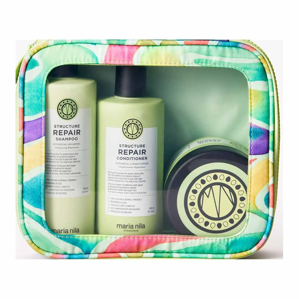 The Structure Repair Beauty Bag is made out of recycled material and contains a full size shampoo, conditioner and hair mask that help damaged hair regain its natural strength, softness and shine.