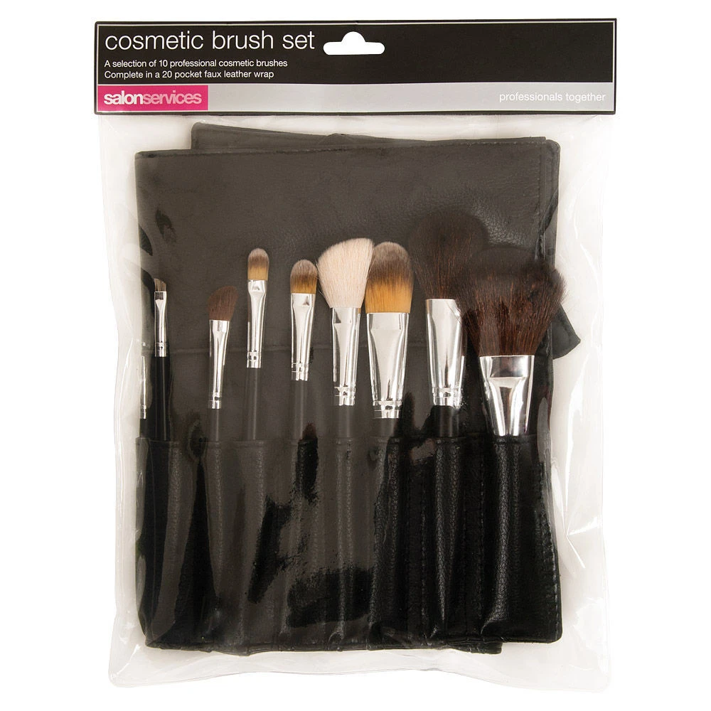 Get the look you want with Salon Services Cosmetic Brush Set. Pack of 10. In a faux leather 20 pocket wrap, so you can add to your collection.
